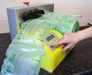 空氣包製造機,緩衝氣空氣包製造機,將膠膜透過氣墊設備充氣封口,可應用於產品的包裝或未滿箱的填充,可用來取代氣泡布、泡泡粒、保麗龍、EPE等傳統包材,適用食品、飲料、醫藥用品、影音商品、化妝品、電子產品等易碎裂包裝物品之保護。